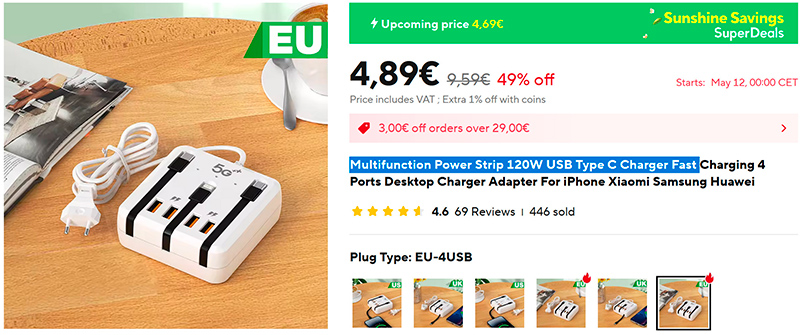 Удобный проводной адаптер (ссылка для РФ) суммарной мощностью в 120 Вт, у которого три встроенных кабеля (два Type-C и один Lightning) и четыре порта (есть варианты четырех USB-A или двух USB-A и двух Type-C).