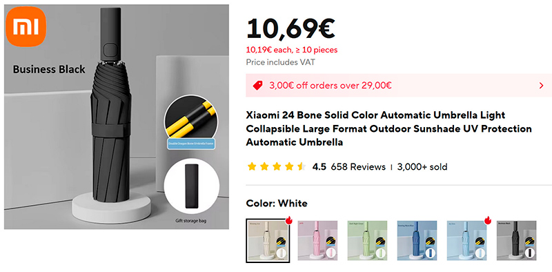 Автоматические складные зонты Xiaomi (ссылка для РФ) различных цветов. 24 спицы, обеспечивающие хорошую защиту от ветра, трехслойный материал, диаметр 108 см.