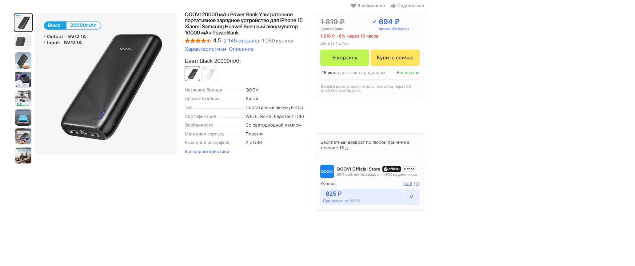 Ёмкость 20000 мАч, есть выходы USB и Type-C, индикатор остатка заряда, корпус из прочного пластика, поддерживает зарядку током 2.1 А.