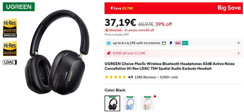 Хорошо себя показавшие (я делал их обзор) полноформатные наушники Ugreen HiTune Max5c (ссылка для РФ). Активный шумодав с режимом прозрачности, поддержка кодека высокого разрешения LDAC, настройка через приложение, мультипойнт, игровой режим, до 75 часов автономной работы.