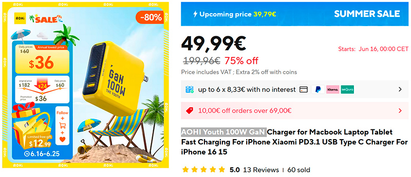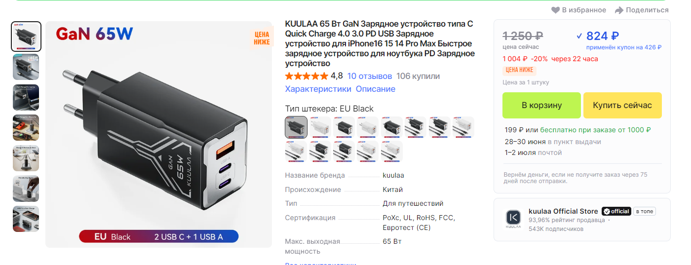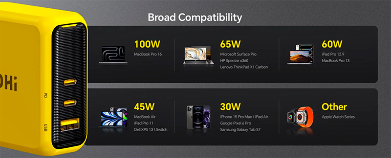 Очень компактный GaN-адаптер AOHI Youth на 100 Вт с поддержкой Power Delivery 3.1. Для питания ноутбуков, зарядки смартфонов, планшетов и так далее. Два порта Type-C, порт USB-A. Производитель достойный, у меня есть их адаптер на 67 Вт - отличный.