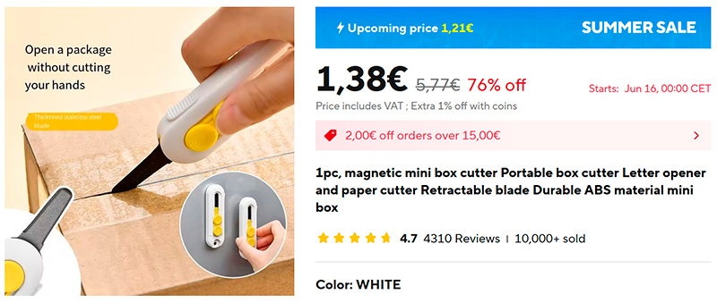 Слишком длинное лезвие, ИМХО. Может повредить содержимое коробки. Лезвие должно быть очень коротким, в этом же весь смысл специального ножа для посылок.