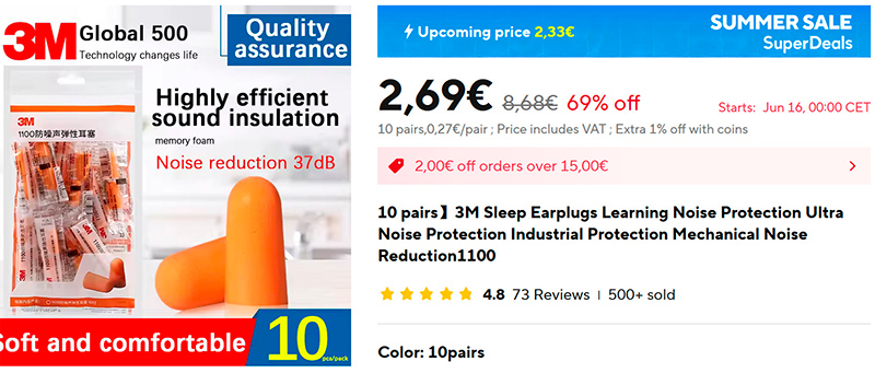 Из всех затычек для ушей, что я пробовал, на мой взгляд, лучшие - это вот эти затычки 3M.Они в ушах почти не чувствуются, при этом эффективно поглощают внешние шумы. А в данном случае еще и комплектация удобная: там каждая пара в своем отдельном пакетике.