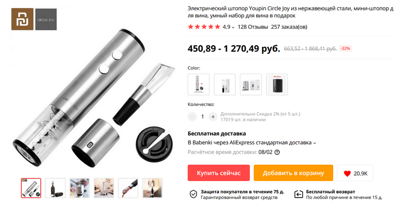 Ну и вот отличный набор от дочки Xiaomi Youpin, где все это есть, причем проверено мною лично - отлично работает! Здесь можно заказать (в том числе и по отдельности) электрический штопор (реально очень удобный и эффективный), быстрый аэратор, вставляющийся прямо в горлышко бутылки, и специальную пробку с помпой, откачивающую воздух в бутылке, чтобы вино не окислялось. Я всем этим хозяйством пользуюсь постоянно: электрический пробочник - вот просто must have, - ну и аэратор и пробка с помпой - очень полезные устройства для красного вина.