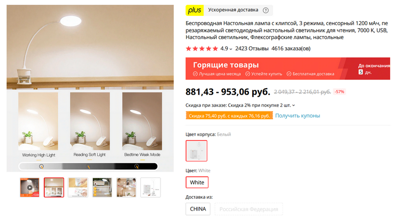 Удобная настольная (она же прикроватная) лампа. Подставка, клипса, 3 режима свечения, встроенный аккумулятор на 1200 мА·ч, с которым лампа проработает до 3 часов на полной яркости и до 5 часов на средней. Силиконовая стойка легко гнется в разных направлениях.