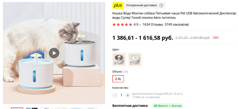автоматическую поилку-фонтанчик … Льющаяся вода побуждает животных больше пить, а это полезно.