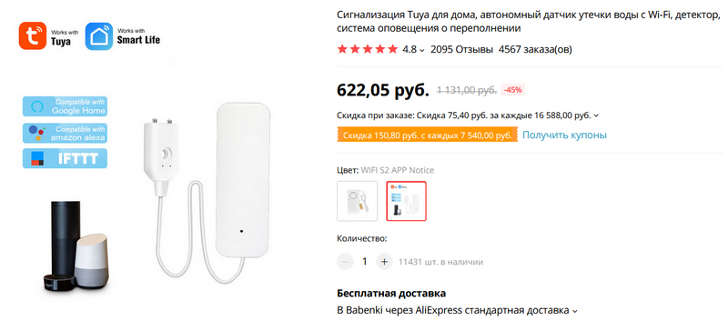 Если у вас дома не установлен датчик протечки воды, что совершенно напрасно, то вот недорогой вариант от китайцев. Там два варианта: просто датчик с динамиком, который начнет орать с громкостью в 110 дБ в случае, если контакты замкнутся, что будет сигнализировать о протечке, и более продвинутый вариант, когда устройство будет связано по Wi-Fi со смартфоном и сможет отправлять информацию на него.