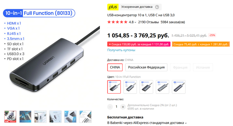 Концентраторы от Ugreen - от "5 в 1" до "10 в 1", где есть все, что только можно придумать. Для ноутбуков - незаменимая штука, да и для ПК вполне пригодится как настольный USB-хаб и кардридер. У самого продвинутого есть доставка с российского склада.