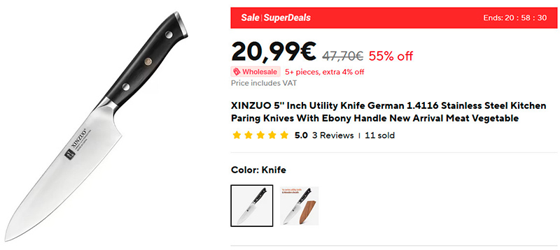 Подбирал себе новый кухонный ножик (ну, хобби у меня такое, время от времени ножи на кухне менять) и искал себе пятидюймовый вариант - он для моих обычных кулинарных задач - самый удобный. Я хорошо знал марку Xinzuo - у них ножи качественные и достаточно недорогие. У меня есть их шеф-нож 8,3", и я им очень доволен (оба-на, а он, оказывается, подорожал, я его за 26 евро покупал). Но я его использую редко, великоват. Мне бы пятидюймовый. Поискал - нашел пятидюймовый и недорогой.