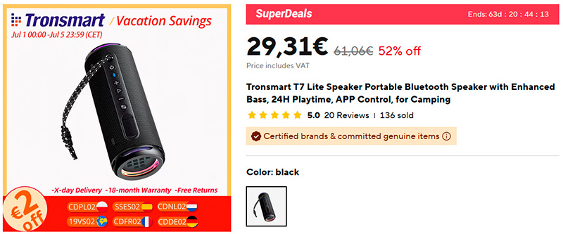 Беспроводная колонка Tronsmart T7. Мощность - 30 Вт, Bluetooth 5.3, аккумулятора хватает на 12 часов (это по тестам, производитель заявляет 24 часа), есть защита IPX7, чистое звучание, расширенный бас, управляется через приложение, в комплекте со второй такой же колонкой составляет стереопару. Да и цена привлекательная: аналогичная JBL стоит за сотню. (Кстати, у моей JBL такого типа почему-то довольно быстро сдох аккумулятор, хотя я ее использовал довольно мало и не разряжал.)