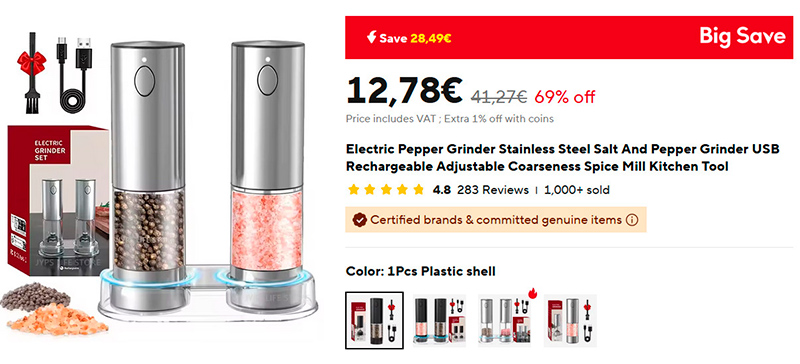 Для нелюбителей электрических солонок и перечниц, которые нужно переворачивать для того, чтобы они заработали, обычные электрические мельнички, заряжающиеся через порт USB. Уровень помола регулируется. Если заказываете две мельнички, то они снабжаются удобной подставкой, которая будет собирать частички соли и перца, которые неминуемо будут высыпаться из мельничек такого типа.