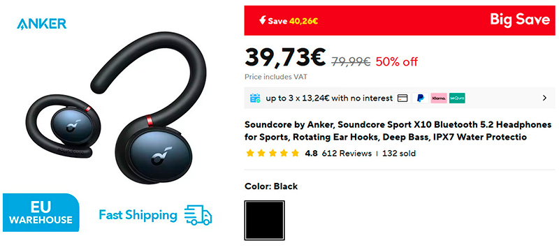 Наушники для активных занятий спортом с надежным ушным креплением Anker Soundcore Sport X10 (я знаю, что многие такие ищут). Защита от воды по стандарту IPX7, высокий уровень пассивной шумоизляции, расширенные басы. От одной зарядки наушники работают до 8 часов, а с учетом зарядки от кейса автономность расширяется до 32 часов работы. 10-минутной зарядки хватит на 2 часа работы. Кодеки - SBC и AAC. Они заметно подешевели, год назад они стоили €78.