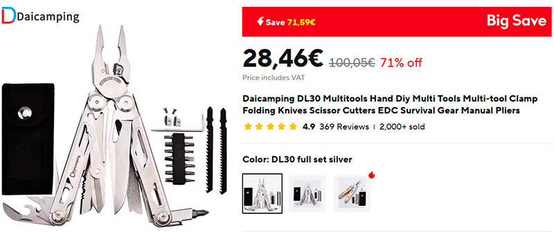 Один из самых популярных мультитулов на Aliexpress - Daicamping DL30. По ссылке вы найдете подробный список того, что этот мультитул в себя включает - там более 20 инструментов. У мультитула более 2 тысяч продаж, рейтинг 4,9.