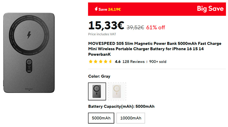 Очень компактный и легкий аккумулятор с поддержкой беспроводной зарядки MagSafe MOVESPEED S05. Примагничивается к смартфону, и смартфоном при этом можно продолжать пользоваться. Если нужен более емкий вариант, то по той же ссылке есть такой же аккумулятор на 10000 мАч за 19 евро.