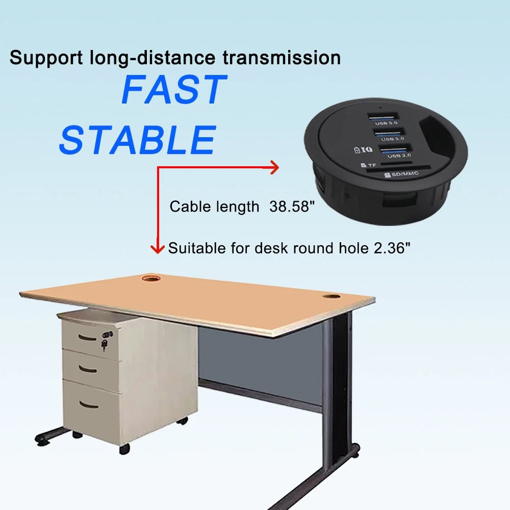Удобный настольный хаб с креплением в столешницу — экономит место и расширяет возможности: один Type‑C (5 Gbps + 5 V/3 A), один USB‑3.0 и два USB‑2.0 порта, слот для SD и microSD карт, аудиоразъём. Питание через адаптер 5 В/2 А, управление Plug & Play — без драйверов.
