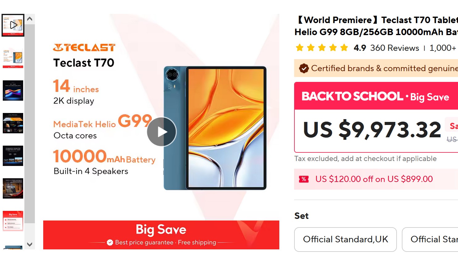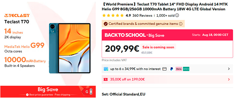 Вот здесь самая низкая цена на новый 14-дюймовый планшет Teclast T70. Платформа Mediatek Helio G99, памяти 8/256 ГБ, LTE, аккумулятор 10000 мАч. У этого производителя вполне пристойные недорогие планшеты, я делал обзор модели Teclast M40.
