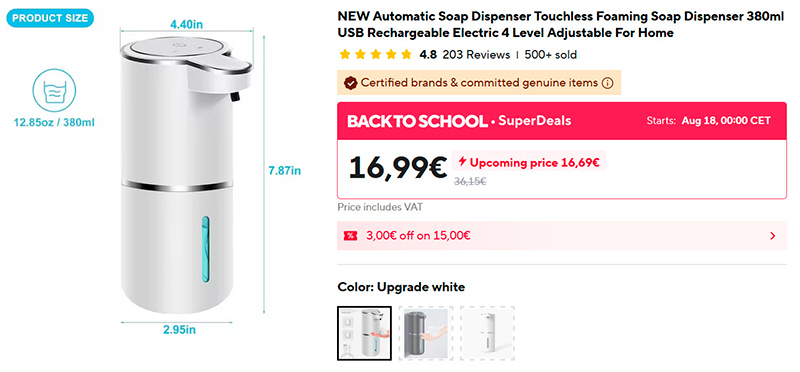 Новый автоматический дозатор для мыла с емкостью 380 мл. 4 режима работы, зарядка через USB, одной зарядки хватает на 2000 срабатываний (как уверяет продавец). Более 500 продаж, рейтинг 4,8. Заказал себе, а то мой дозатор сломался несколько месяцев назад.