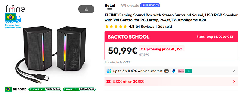 Колонки FIFINE А20. Питаются через USB порт и не требуют подключения к розетке. Имеют два динамика и выдают стереозвучание мощностью 4 Вт. Также оснащены яркой динамической RGB-подсветкой.