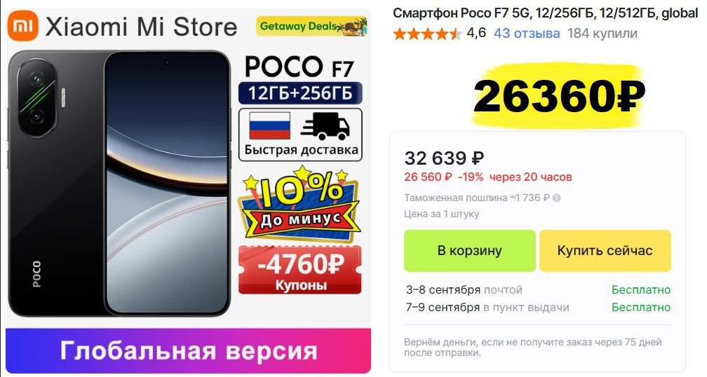 Смартфон Poco F7 5G 12/256 GB на AliExpress в распродажу за 26360 р.