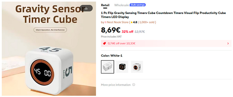 Удобный таймер для самых разнообразных применений. У него предустановлены временные интервалы 5, 10, 25 и 45 минут, и вам достаточно просто повернуть кубик нужной стороной, и таймер запустится, показывая на лицевой грани, сколько осталось. Он бесшумный, только издаст сигнал, когда время закончится. Предустановленные интервалы можно настраивать под себя, ну и также можно выставлять любой, нужный вам интервал. Более 1000 продаж, средний рейтинг 4,8.