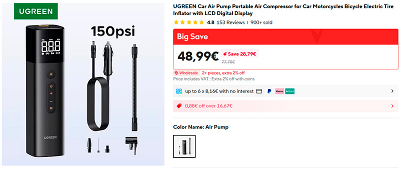 Очень компактный автомобильный электрический насос UGREEN Car Air Pump. Питается от прикуривателя, имеет удобный LCD-дисплей, в комплект входят различные насадки, максимальное давление - 150 PSI. Для автомобиля, мотоцикла, велосипеда и мячей.