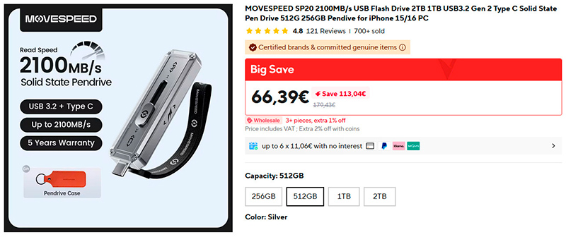 Внешний SSD в формате флешки от Movespeed. Скорости бешеные - до 2100 MB/s. Порты - USB-A и Type-C 3.2. Емкости - 256GB, 512GB, 1TB и 2TB.