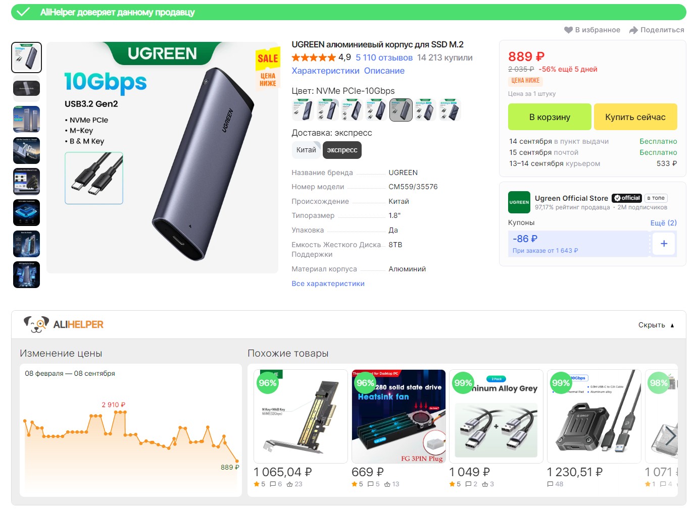 Выполнен из алюминия, интерфейс USB 3.2, скорость передачи данных до 10 Гбит/с, совместим с ОС Windows, Linux, MacOS, Android.