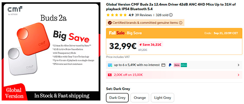 Компания Nothing выпустила новые недорогие наушники CMF Buds 2a. Удобный форм-фактор, хороший звук, как пишут в отзывах, есть активный шумодав 42 дБ с режимом прозрачности, есть шумодав для разговоров, хорошая автономность. Bluetooth 5.4, до 8 часов от одного заряда, до 35 часов с подзарядкой, влагозащищенность IP54, мультипойнт, интегрированный ChatGPT, настройка в приложении. И это все - за 33 евро!