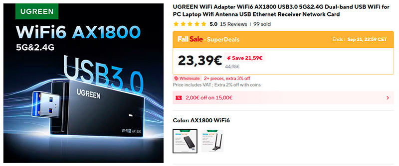 Двухдиапазонный адаптер UGREEN WiFi6 AX1800 - для ПК, для ноутбуков с хилым адаптером. По той же ссылке есть вариант такого же внешнего адаптера с двумя антеннами - для устойчивого приема WiFi при плохом уровне сигнала.