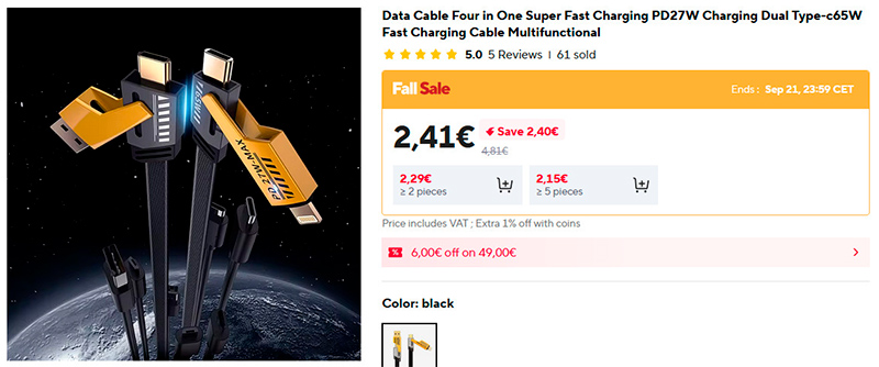 Универсальный кабель Type-C - Type-C, у которого есть встроенные переходники на USB-A и Lightning. Поддерживает мощность зарядки до 65 Вт.