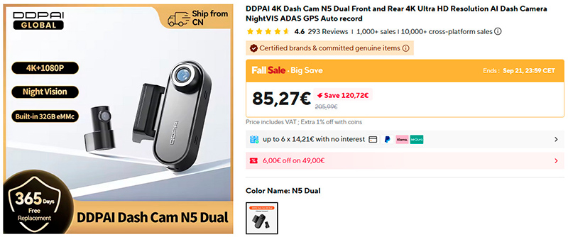Очень продвинутый компактный видеорегистратор DDPAI 4K Dash Cam N5 Dual. Две камеры: у передней разрешение 4К (3840x2160), у задней - FullHD. Ну и полный фарш: встроенный GPS, голосовое управление, управление через приложение, ночное видение, угол 140 градусов, система ADAS, режим парковки, поддержка карт памяти до 512 ГБ, дополнительная встроенная память eMMC на 32 ГБ, куда автоматически сохраняются те фото и видео, которые нужно хранить. Это очень достойный производитель, у меня было несколько его видеорегистраторов на тестах. Более 10 тысяч продаж, средний рейтинг 4,6 (293 голоса).