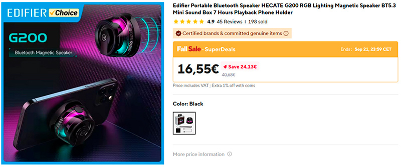 Беспроводная миниколонка Edifier HECATE G200. Подключается по Bluetooth 5,4, имеет RGB-подсветку, может прилипать к любой поверхности, включая смартфон или планшет, и для смартфона/планшета также служит подставкой. До 7 часов работы от одного заряда.