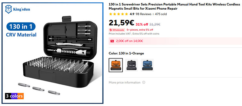 Мощный набор прецизионных отверток " 130 в 1" подходит для ремонта практически чего угодно. Включает 121 насадку разных размеров и форм, ручка, удлинитель, пинцет, присоска, лопатки, инструмент для поддевания.