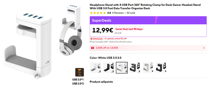 Удобная штука - подвеска для наушников, которая крепится к торцевой части стола, она же - USB-хаб на четыре порта. У меня именно такая служит верой и правдой уже года четыре, если не больше. Кстати, прикручивать ее не нужно, там стоит довольно мощная пружина, которая прижимает держатель к столу.