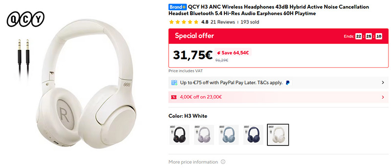 Недорогие беспроводные наушники-полноформаты с активным шумоподавлением QCY H3. Пять микрофонов, гибридная технология активного шумодава, есть режим прозрачности, управление через приложение. 60 часов работы от аккумулятора, Bluetooth 5,4, кнопочное управление. Пять вариантов цветов.