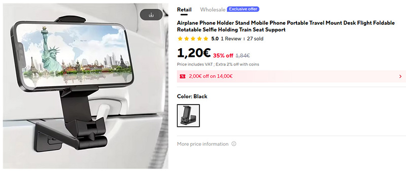 Интересный держатель для смартфона, который можно крепить к закрытому столику переднего кресла в самолете, к столу, к полке, к откидному столику в поезде - в общем, вариантов там немало.