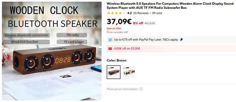 Любопытная беспроводная деревянная колонка с дисплеем, будильником и FM-радио. Также может подключаться по проводу.