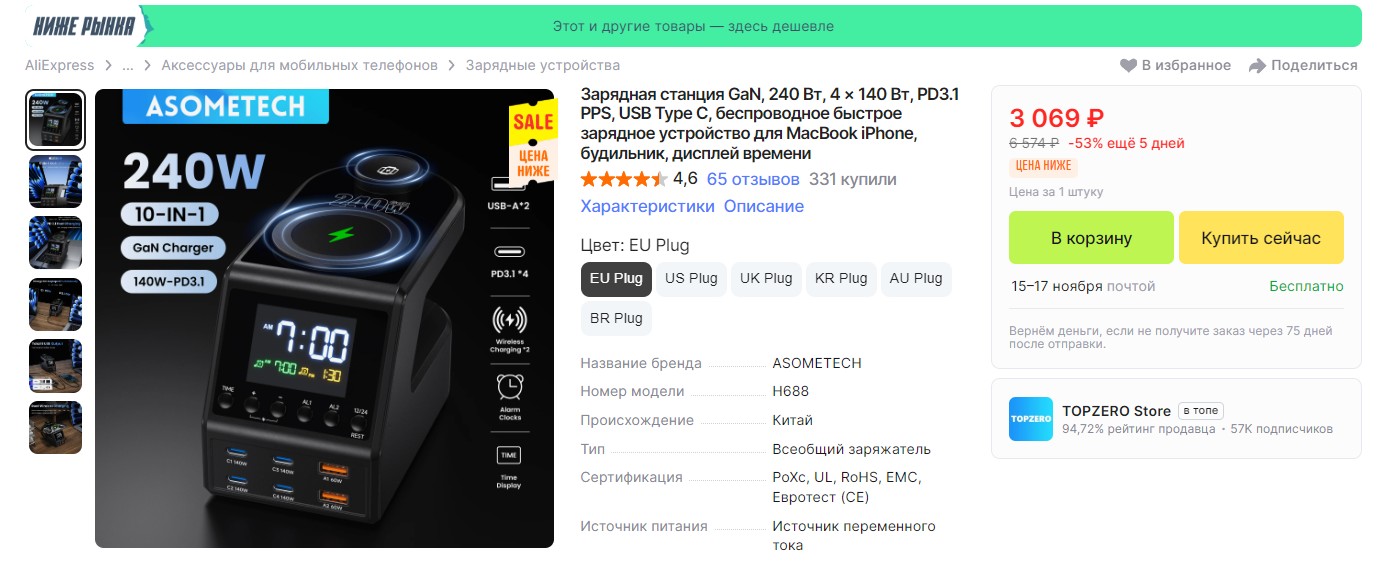 Скидка на зарядное устройство AOHI Youth 65W GaN