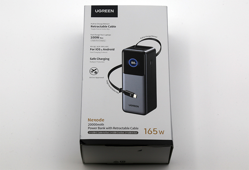 Первым делом - напишу о самом крутом устройстве: UGREEN Nexode внешний аккумулятор 20000 мАч, 165 Вт с выдвижным кабелем. Для быстрой зарядки ноутбуков и, вообще говоря, чего угодно. Удобный выдвижной кабель с Type-C (100 Вт), два порта Type-C (65 Вт) и USB-A (33 Вт). Большой удобный дисплей, на котором показывается уровень зарядки аккумулятора и текущие мощности зарядки по каждому из портов. Поддержка протоколов PD3.0, QC4.0 и PPS.