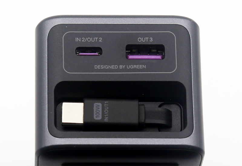 На верхней грани - два порта и выдвигающийся кабель Type-C с мощностью зарядки 100 Вт. И, таким образом, этот аккумулятор может заряжать/питать сразу два ноутбука, так как общая мощность тут аж 165 Вт.