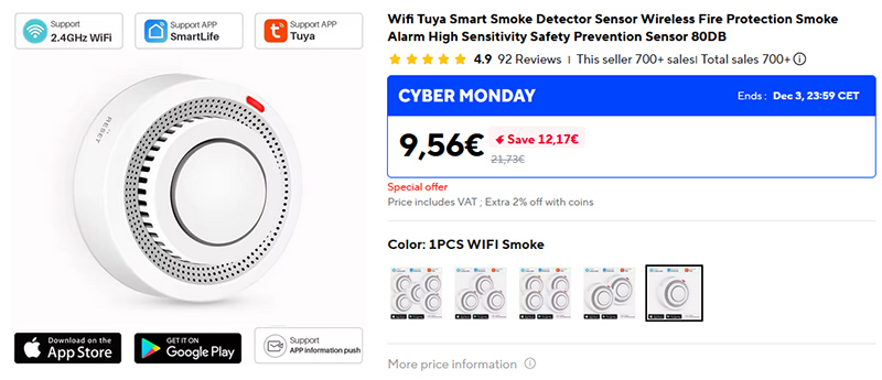 Необходимая в хозяйстве вещь - датчик дыма Tuya. Обнаруживает задымление на ранней стадии, отправляет уведомление на смартфон и подает громкий звуковой сигнал. Работает от обычных батареек и подключается к Wi-Fi. Подключается через приложение.