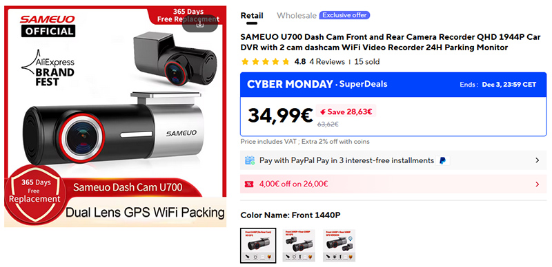 Недорогой компактный видеорегистратор SAMEUO U700 с разрешением 2К (2160x1440p). Настраивается через приложение на смартфоне. Есть вариант комплектации с дополнительной задней камерой FullHD и встроенным GPS.