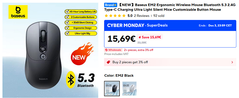 Новая версия популярной эргономичной мышки от компании Baseus: разрешение 4000 dpi, подключение через адаптер и по Bluetooth, поддержка Bluetooth 5,3, две настраиваемые кнопки, зарядка через Type-C.