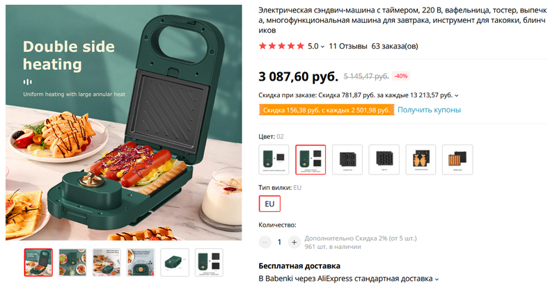 Очень компактная сэндвич-машина (двухсторонний электрогриль) с таймером и сменными панелями. Можно купить с панелью для выпечки вафель.