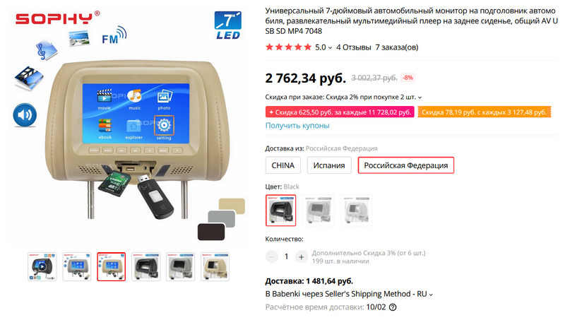 Встроенный в подголовник переднего кресла видеоплеер - признак очень дорогих машин. Но даже если у вас недорогая машина, то ребенка запросто можно будет порадовать таким плеером, чтобы он не скучал в дороге: на Aliexpress есть подголовники для автомобиля различных цветов со встроенным 7-дюймовым плеером. Доставка с российского склада - 1481 рубль, так что подголовник обойдется в 4244 рубля.