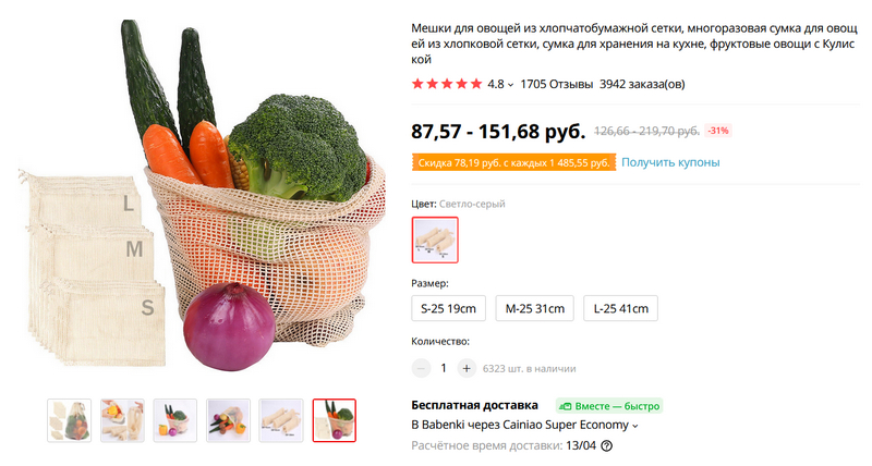 Многоразовые сетчатые мешочки разных размеров для хранения овощей и фруктов. Горловина у них затягивается.