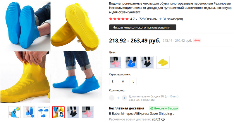 Водонепроницаемые чехлы для обуви разных цветов и разных размеров. Удобная штука, чтобы держать в сумке или в машине. Неожиданно пошел дождь, а вы в матерчатой обуви? Надеваете такие чехлы, и обувь не промокнет.