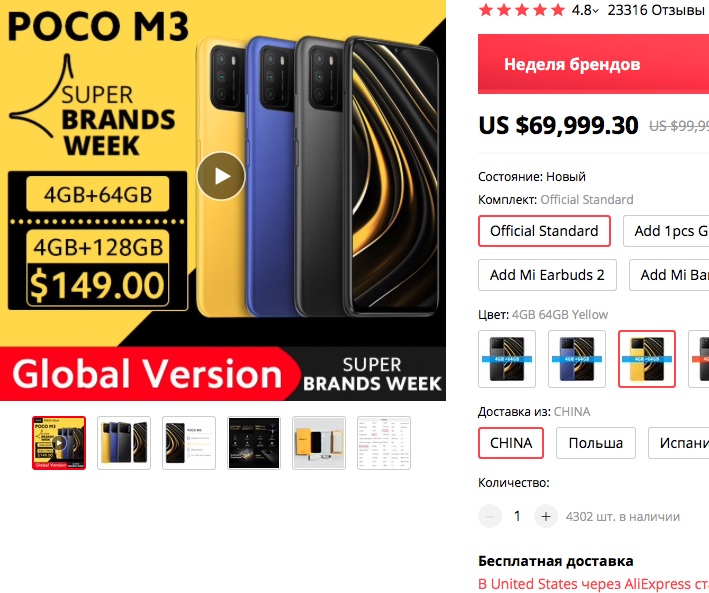 Xiaomi знатно тролит США! Если поменять страну доставки на США, то цена за смартфон поднимется почти до 70 тысяч долларов (с учетом скидки). В другие страны цены адекватные и сейчас распродажа, кстати 😉