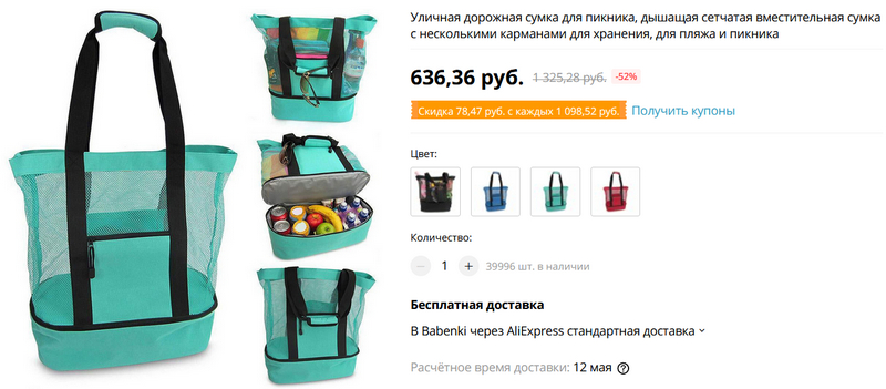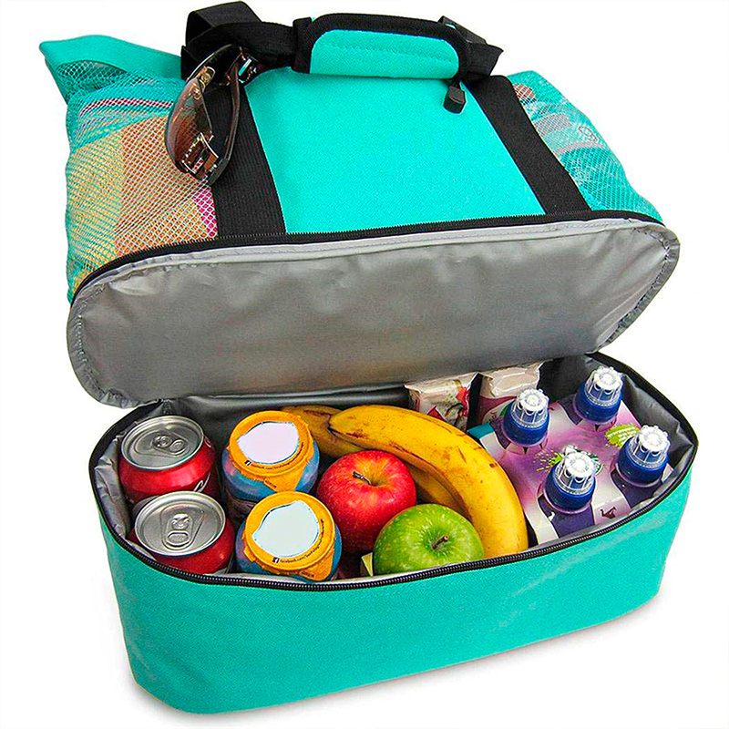 Ну и туда же для комплекта - удобная двухуровневая сумка для пикника (или, может быть, похода на пляж на весь день), причем нижняя часть какое-то время сохраняет холод. Четырех разных цветов.