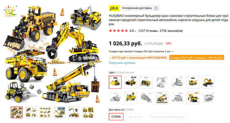 Неплохой выбор конструкторов всякой строительной техники - от простенького погрузчика до крутого суперкрана. У двух моделей есть доставка с российского склада, но там количество сильно ограничено.